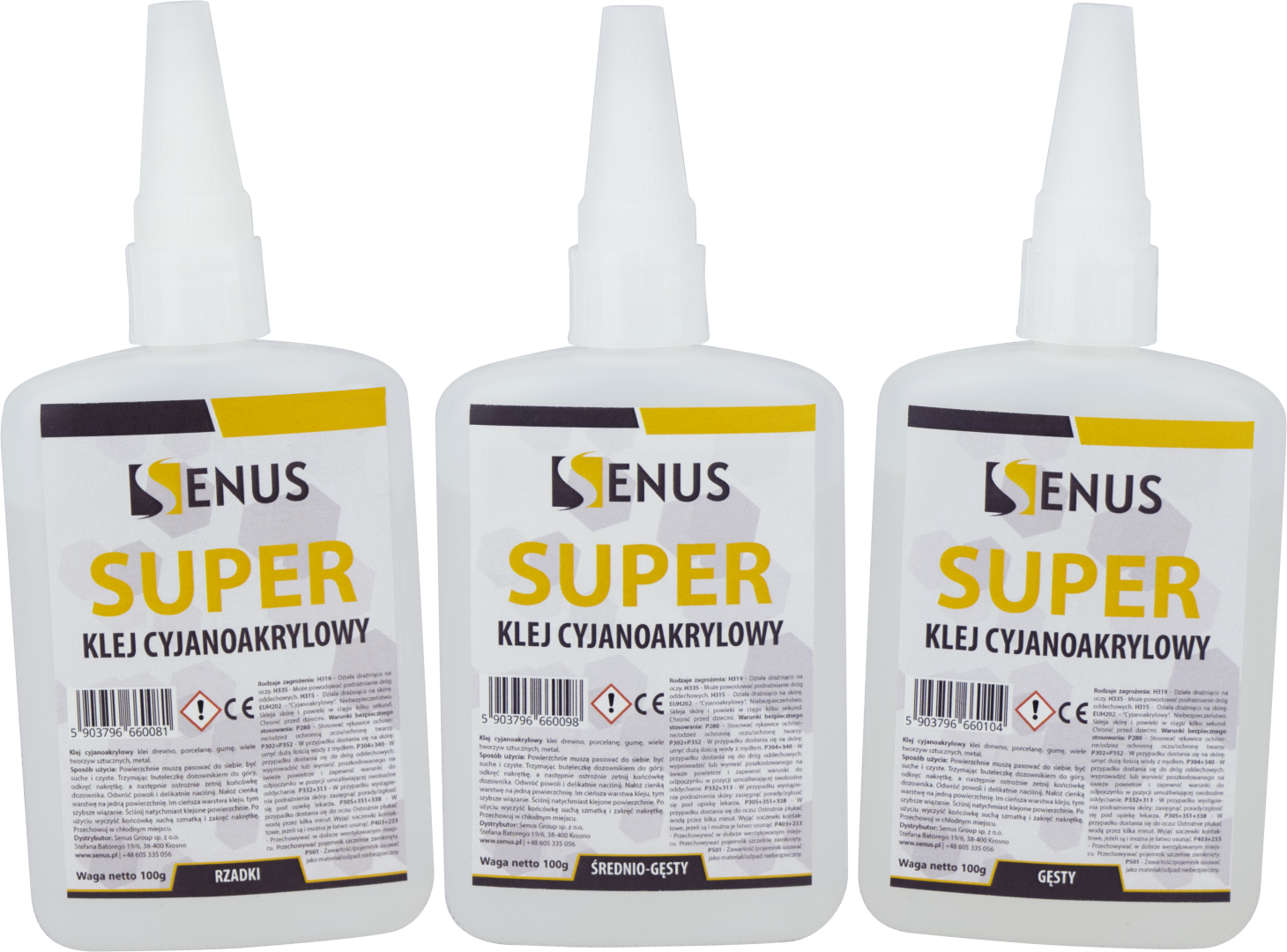 Kleje cyjanoakrylowe marki Senus dostępne są w 3 różnych gęstościach – rzadkich, średnich, oraz gęstych, dzięki czemu każdy odnajdzie idealny preparat dla siebie o określonej lepkości.